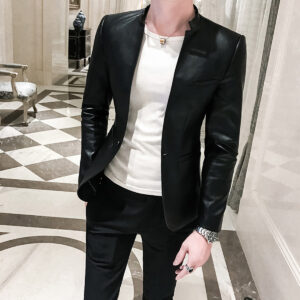 Men’s Black Genuine Sheepskin Stand Collar Casual Office Business Leather Blazer